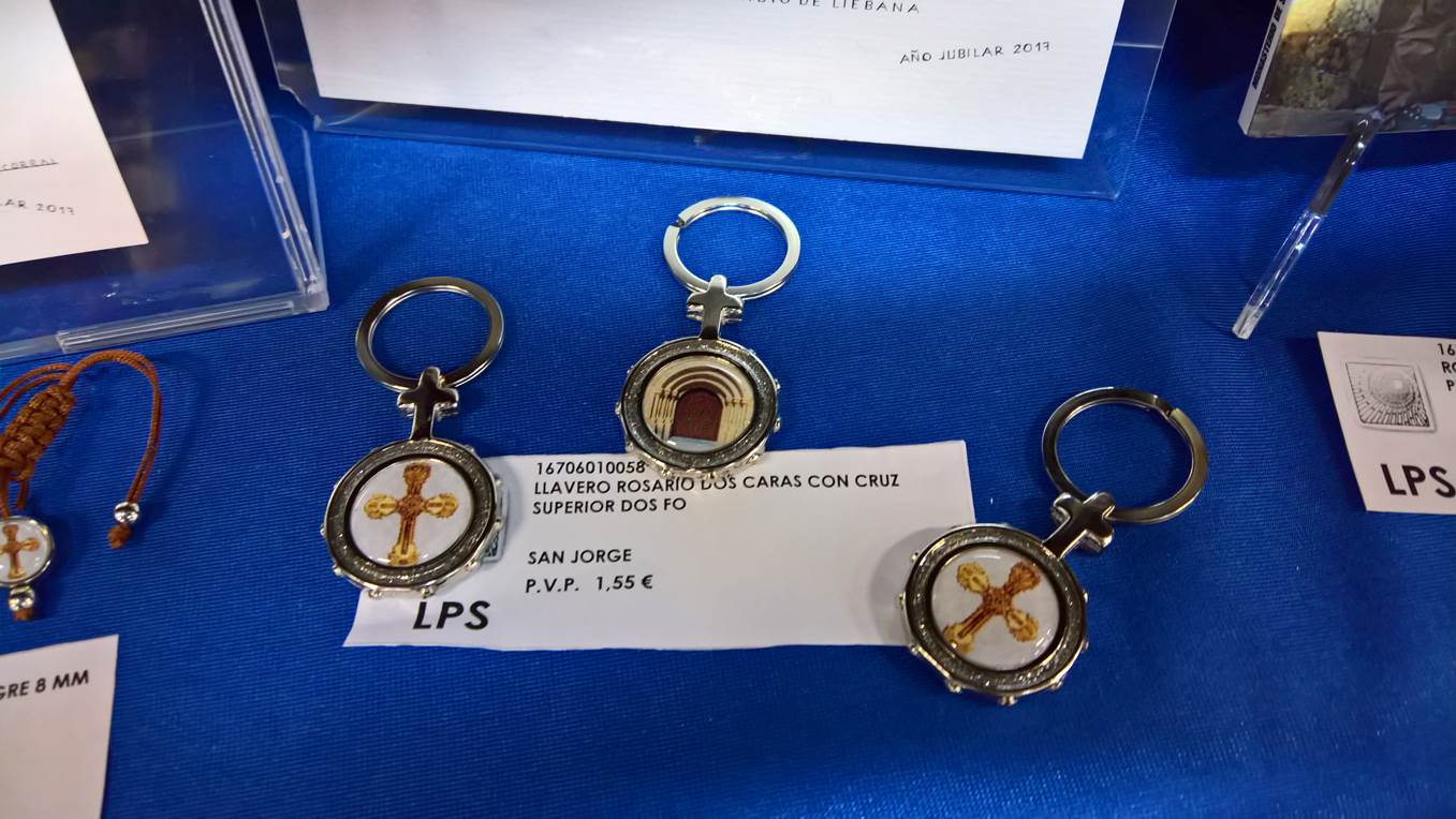 También contamos con existencias renovables de rosarios alusivos a la Santa Cruz de Liébana, el rosario “del peregrino”, pulseras con dijes decorativos, llaveros de doble cara con el Lignum Crucis y la Puerta del Perdón.