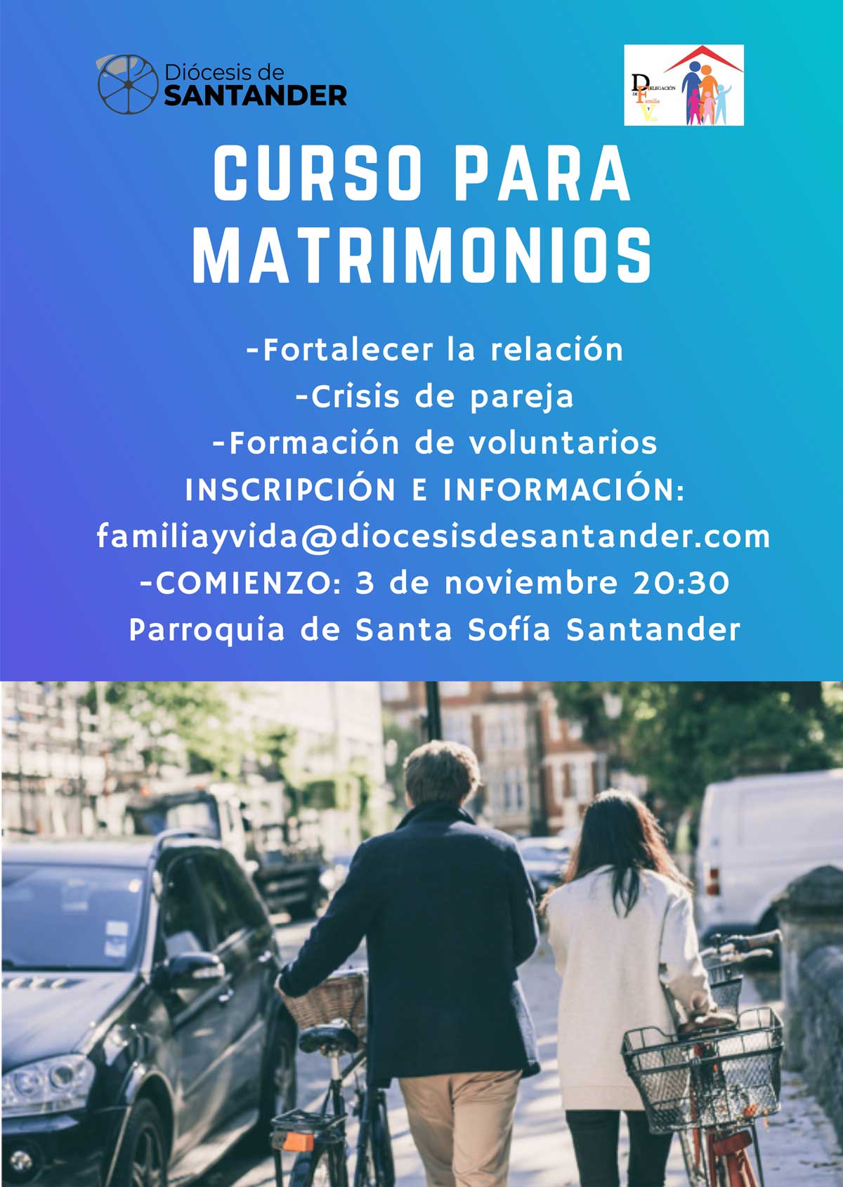 Desde la Pastoral de Familia y Vida queremos animaros, sin importar cuánto tiempo llevéis juntos, si como matrimonio estáis bien o estáis pasando por una situación de conflicto, sea cual sea vuestra situación, este curso es muy adecuado. El material necesario lo proporciona la Parroquia.