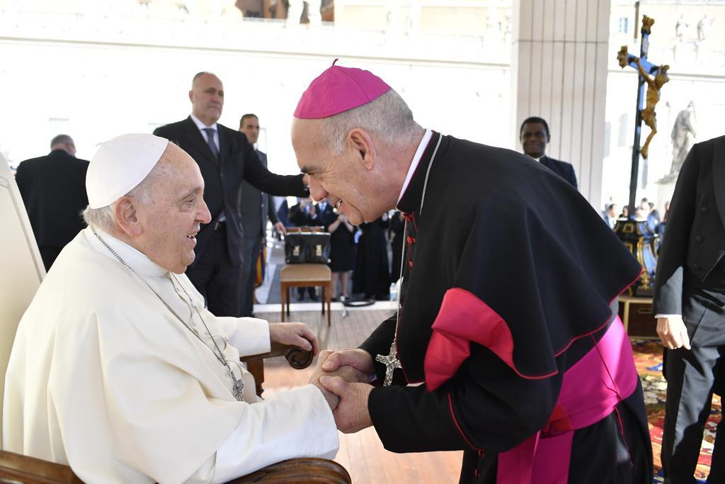 Durante la breve conversación que puede sostenerse mientras se saludaron afectuosamente, pudo manifestarle al Santo Padre aquello que era su intención al emprender el pasado martes el viaje a Roma: mostrar su agradecimiento por su elección como obispo para nuestra Diócesis.